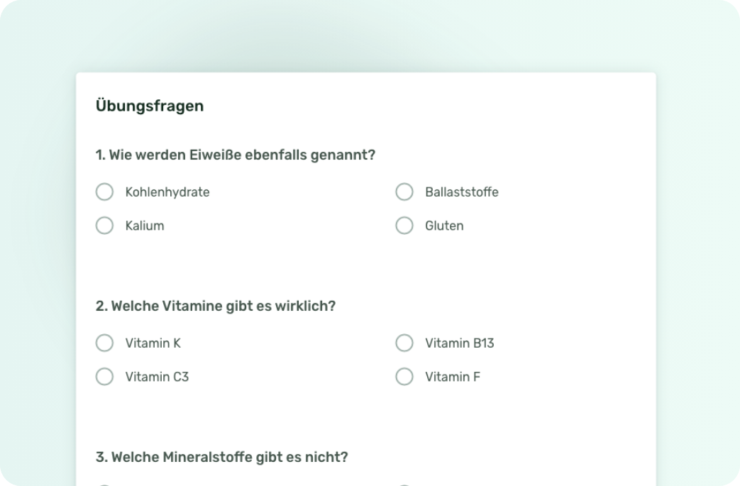 Teste dein Wissen in jeder Lektion und festige dein gelerntes Wissen. Nach erfolgreichem Abschluss einer Lektion wird die nächste in der kommenden Woche freigeschaltet.